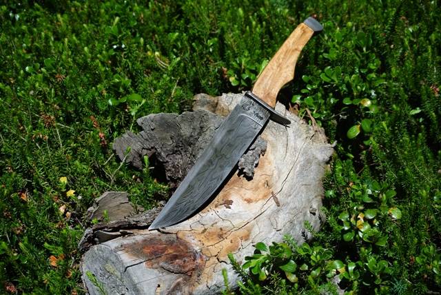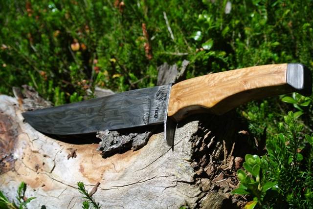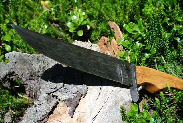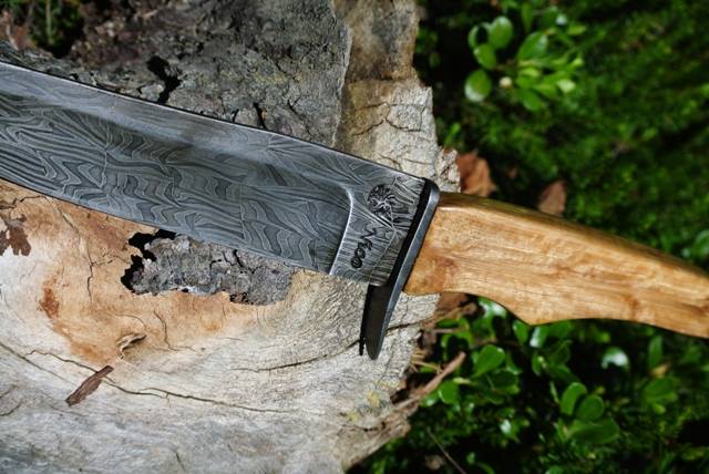 Nous avons donc créé cette lame sur mesure, selon des dimensions précises. Le tranchant de la lame devait mesurer 20 cm, pour une épaisseur de 4.5 cm. Le manche mesure 13 cm, et se fini par un pommeau, lui aussi damassé, dans lequel vient se visser la soie. Ce système d'assemblage permet d'avoir un couteau entièrement démontable, sans collage. Ceci permet de pouvoir retravailler sur le manche ou la lame en cas de besoin.