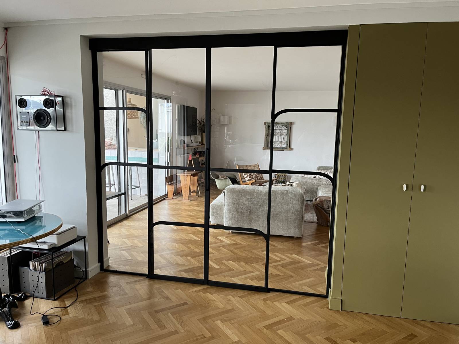 Nous avons créé cette verrière avec 2 portes coulissantes pour des clients qui souhaitaient séparés le salon de la salle à manger, dan sœur appartement du centre ville de Marseille.