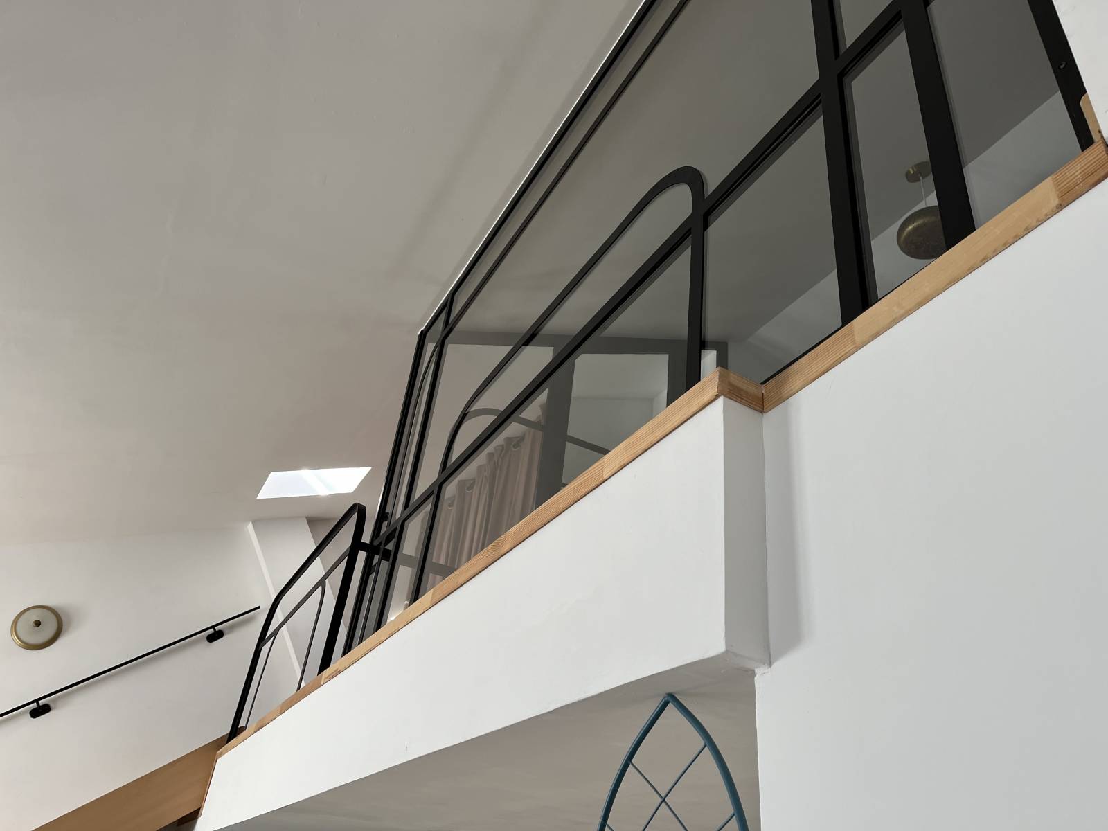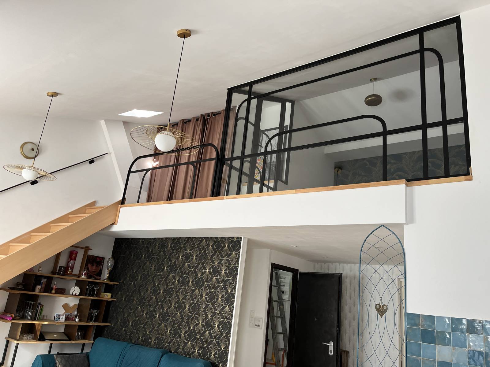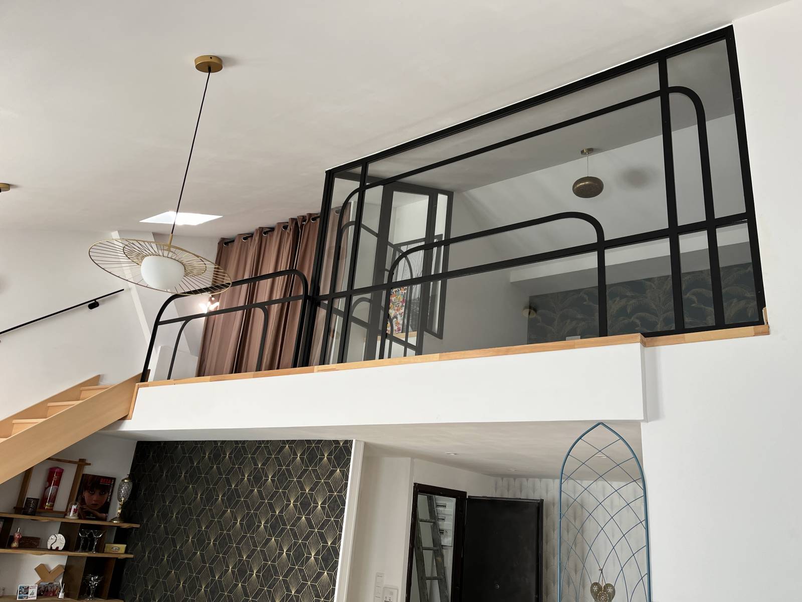 Nous avons peint la verrière en noir mat, ce qui ressort plus bien sur les murs et la décoration existante.