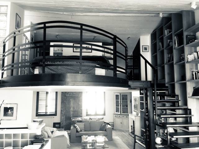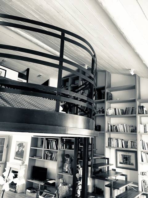 Finalement, nous avons opté pour un garde corps entièrement en acier, pour rester en accord avec la structure acier de la mezzanine, et alléger au maximum la pièce. En effet, ce garde-corps n’alourdit pas visuellement la pièce principale, l'ensemble reste fin et harmonieux. Malgré cette finesse visuel, la structure du garde corps se reprend sur les poteaux soudés à la mezzanine, ce qui garanti une très bonne rigidité.