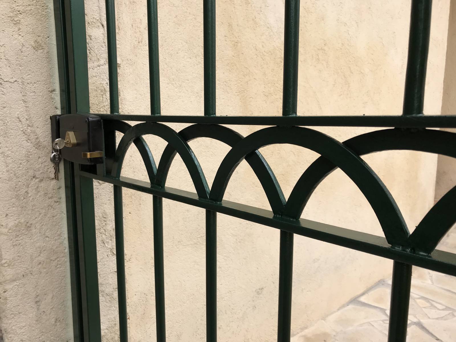 Le propriétaire souhaitait que le portillon ne puisse pas s’ouvrir sans la clef, nous avons donc choisi une serrure sans poignée, qui ne puisse pas s’ouvrir de l’extérieur.