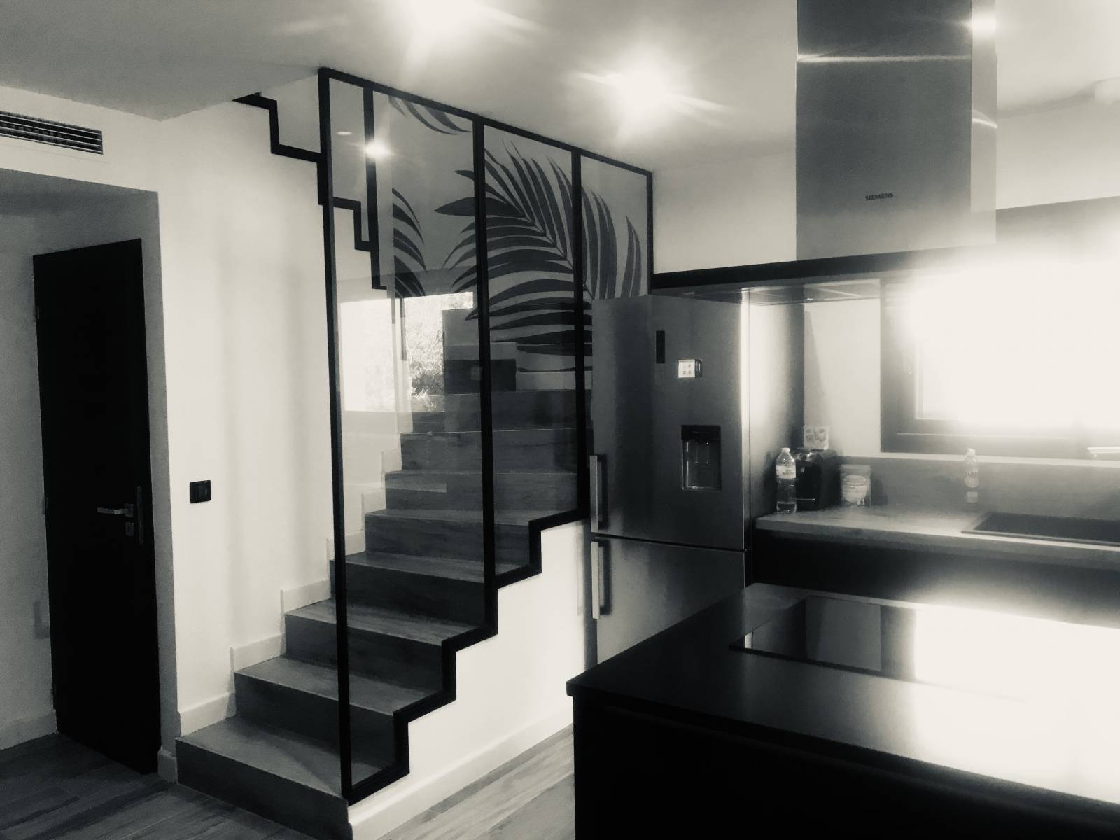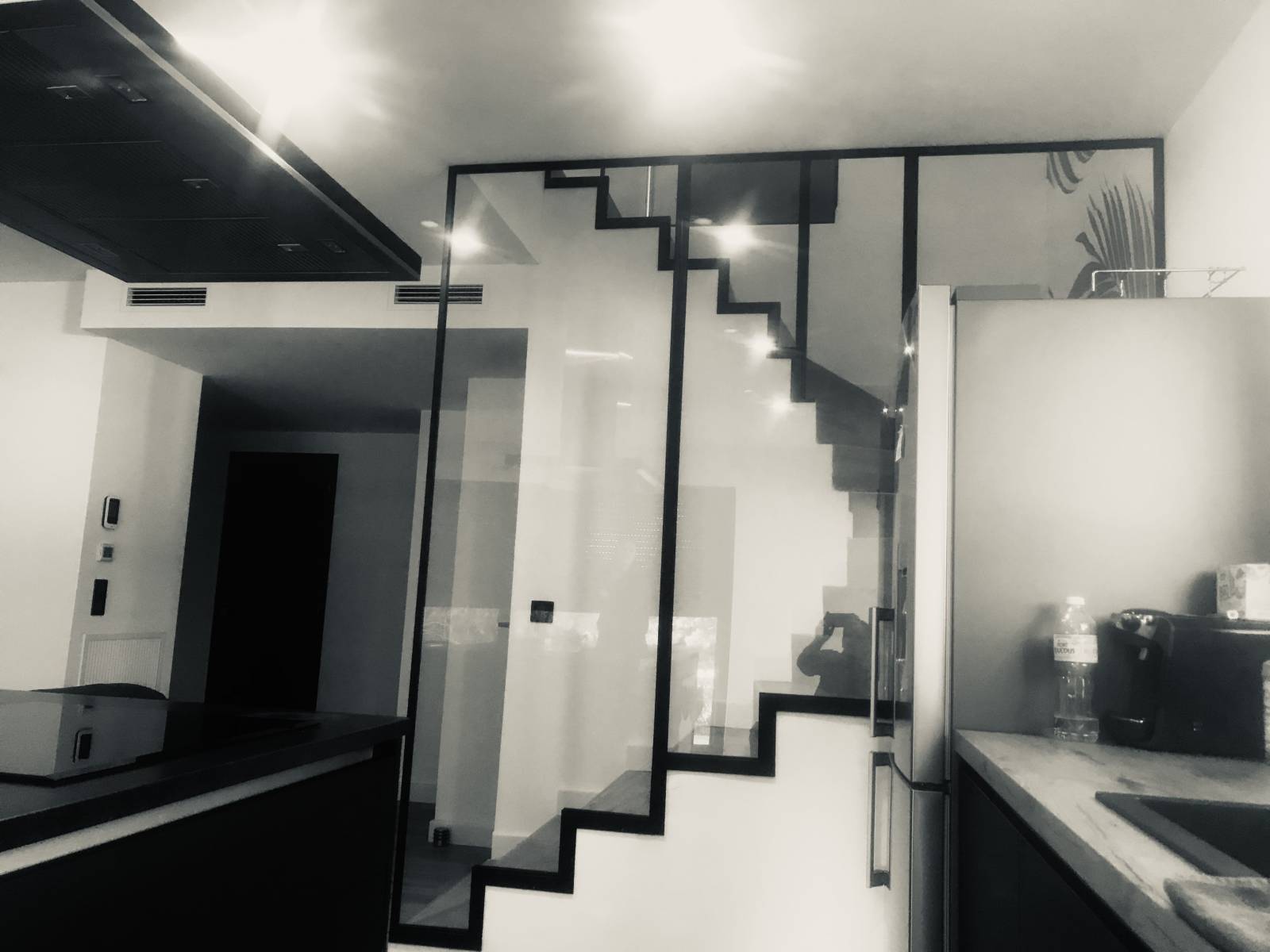 Le reste de la fabrication a été faite en atelier. Une fois toutes les finitions faites, nous avons posé les structures définitivement sur place. Nous avons posés les verres dans un second temps, car les délais de découpe pour ce type de vitrage peuvent être particulièrement longs.