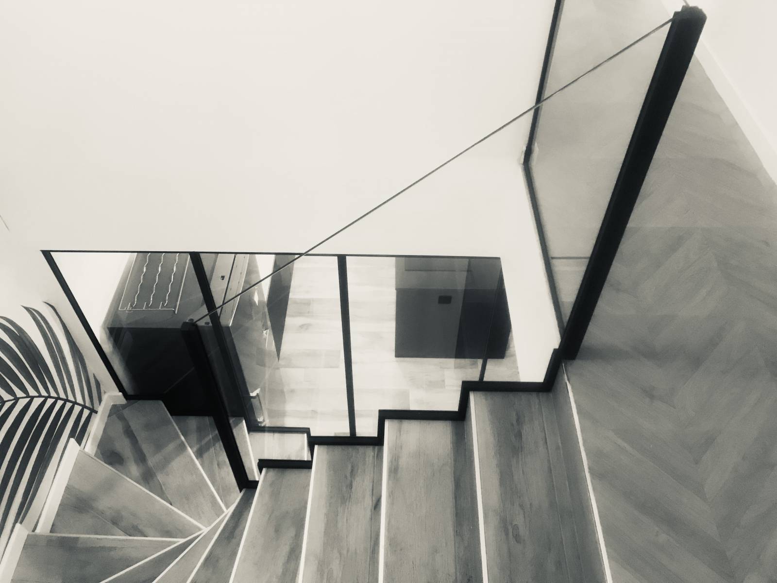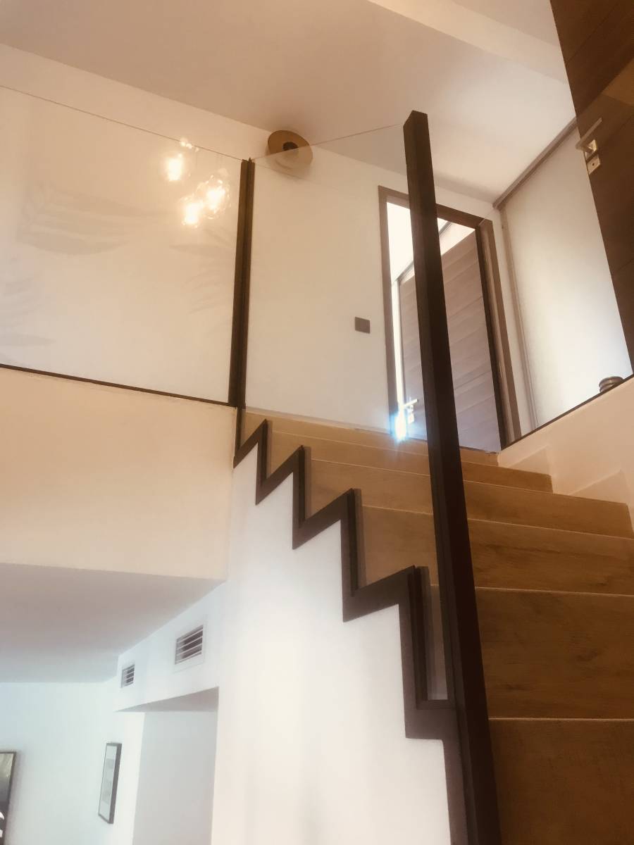 Les structures acier de ces gardes-corps suivent parfaitement les bords des marches de l'escalier. Pour ce faire, nous avons fabriqué ces structures sur places, dans la maison, directement sur les marches.