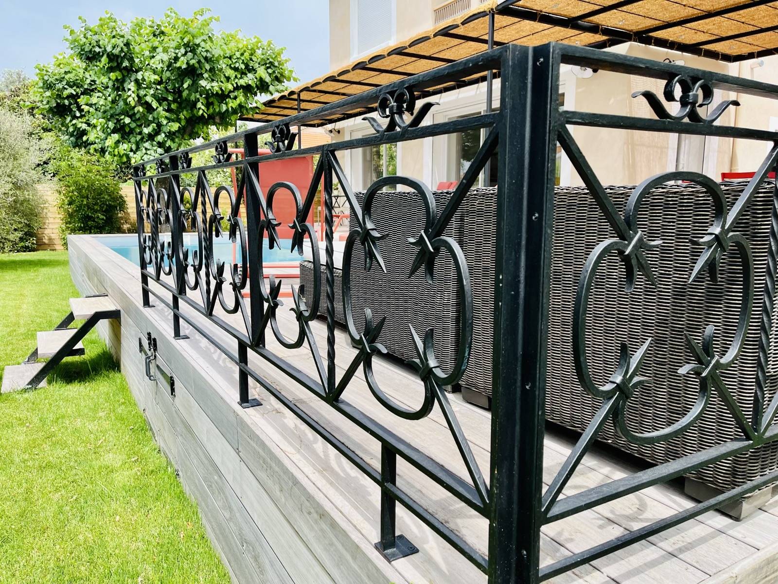 Nous avons ensuite fabriqué le garde corps de la terrasse de la piscine, ainsi que le portillon de l’escalier, en récupérant aussi les motifs de l’ancienne clôture de la maison.