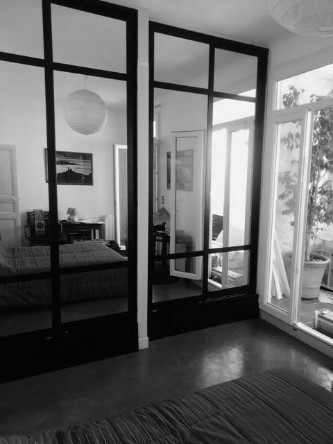 Nous avons tout d'abord créé une armature en acier: un encadrement complet du dormant en bois, avec un rail au sol. Les portes ont un structure en "tube à L", pour qu'elles restent le plus rigide possible dans le temps. Elles sont équipées de roues sur la partie basse pour le coulissement. Elles sont guidées en haut par un rail fabriqué sur mesure.