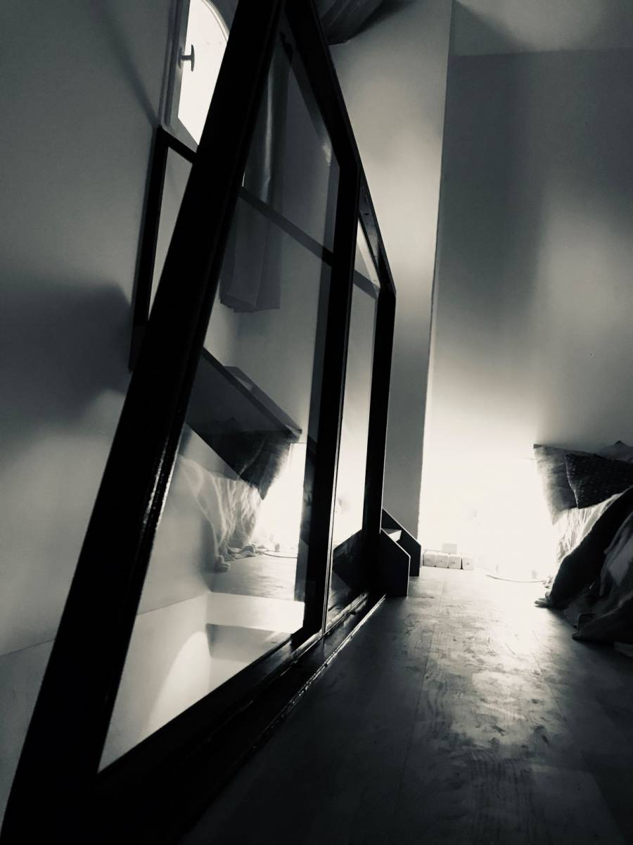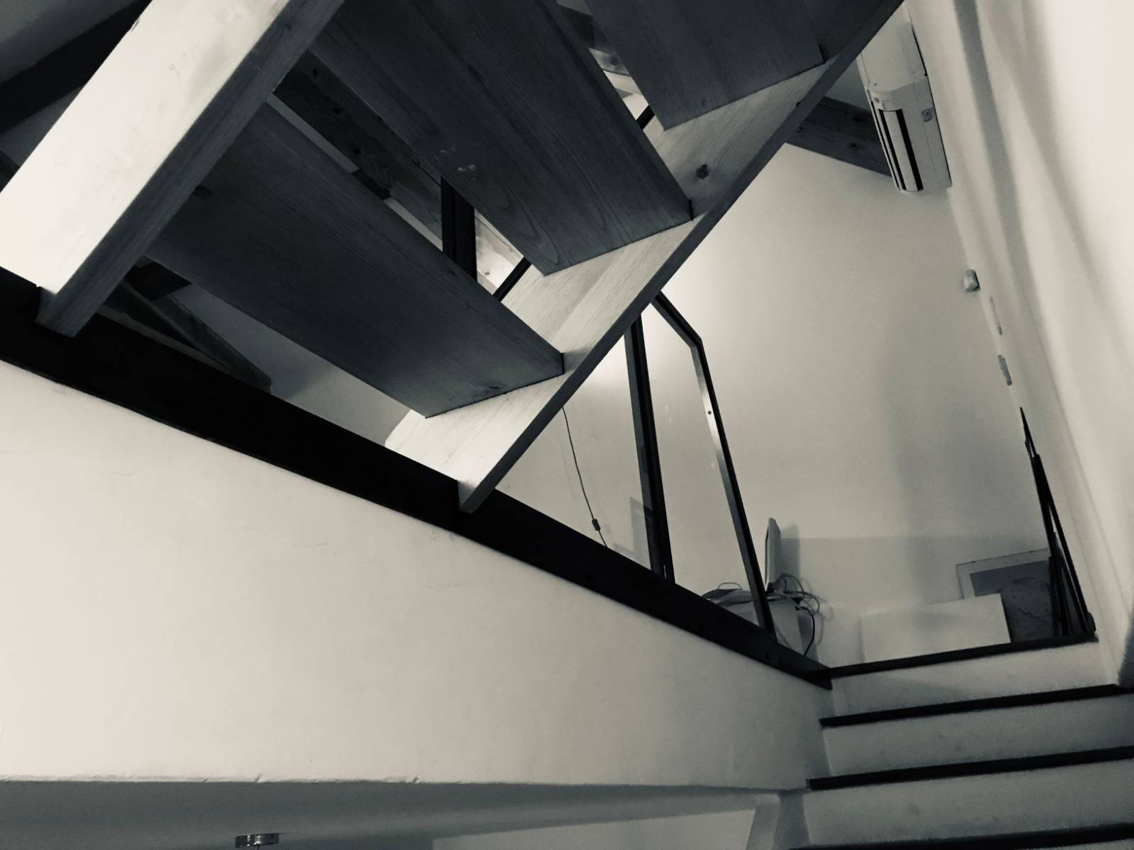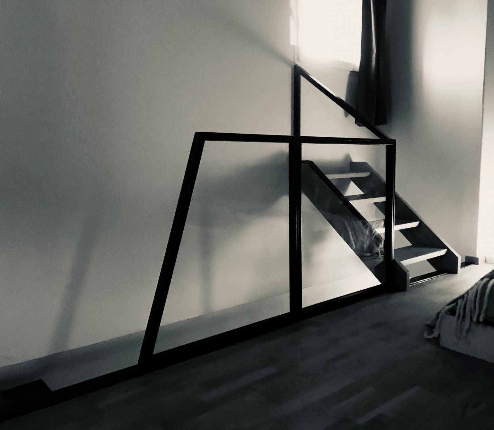 Nous avons au départ réfléchi à un garde corps assez bas, pour ne pas occulter les volumes de la pièce. Notre cliente avait dans un premier temps pensé l'intérieur du garde corps avec des tôles découpées au laser, de manière aléatoire. Ce système n'était pas convaincant esthétiquement, nous avons donc dessiné quelques projets avec des filantes horizontales en acier. Finalment, dans un soucis de garder de la clarté dans la pièce, il a été choisi de vitrer l'intérieur du garde corps, ainsi que la partie rampante.
