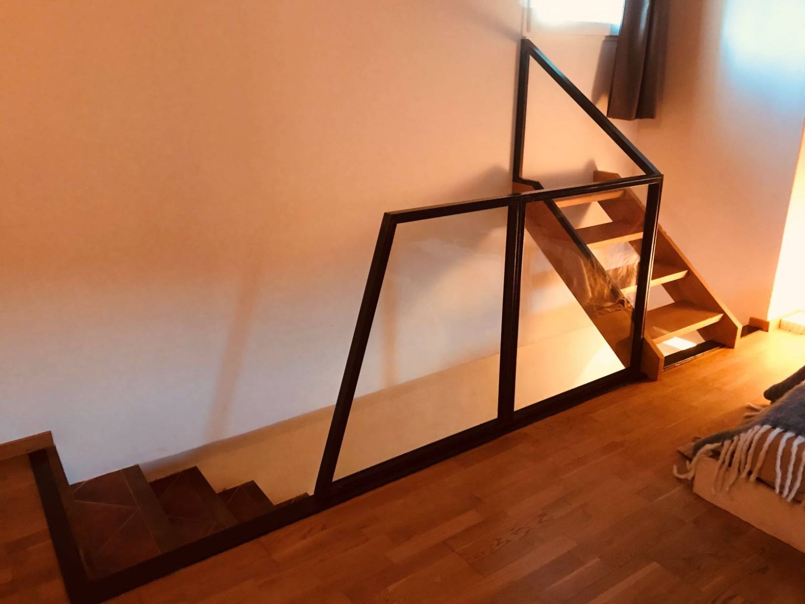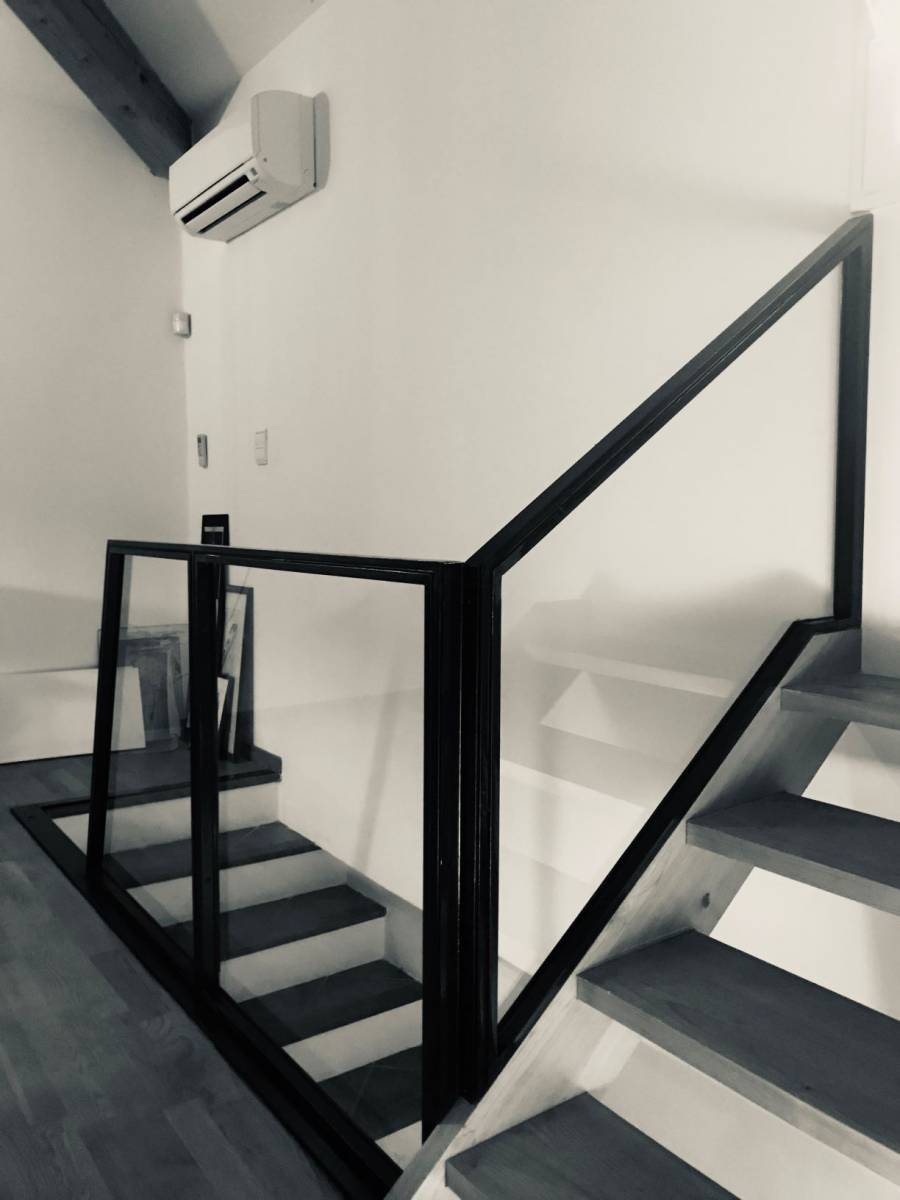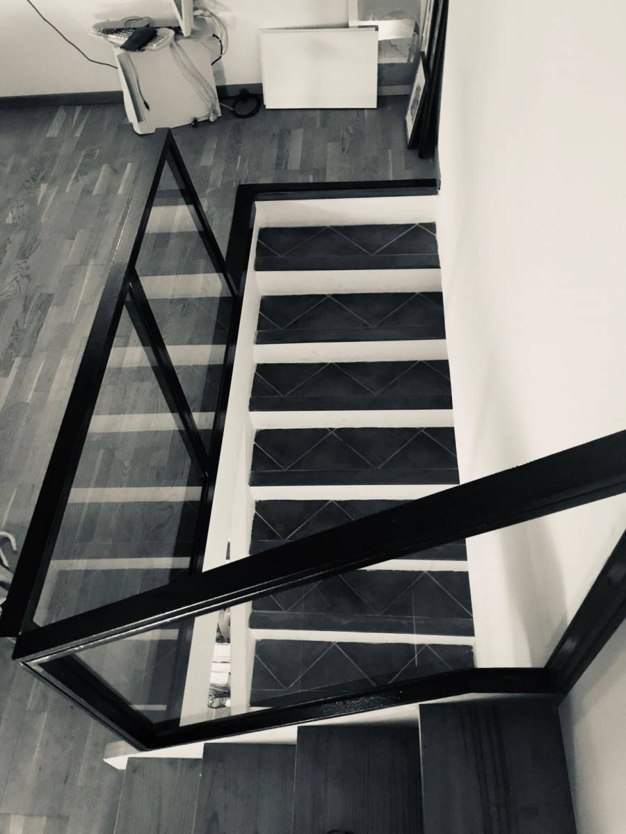 Nous avons préféré garder une hauteur standard à ce garde corps pour plus de sécurité, et de manière à ajuster le poteau de la partie rampante avec le cadre de la fenêtre.