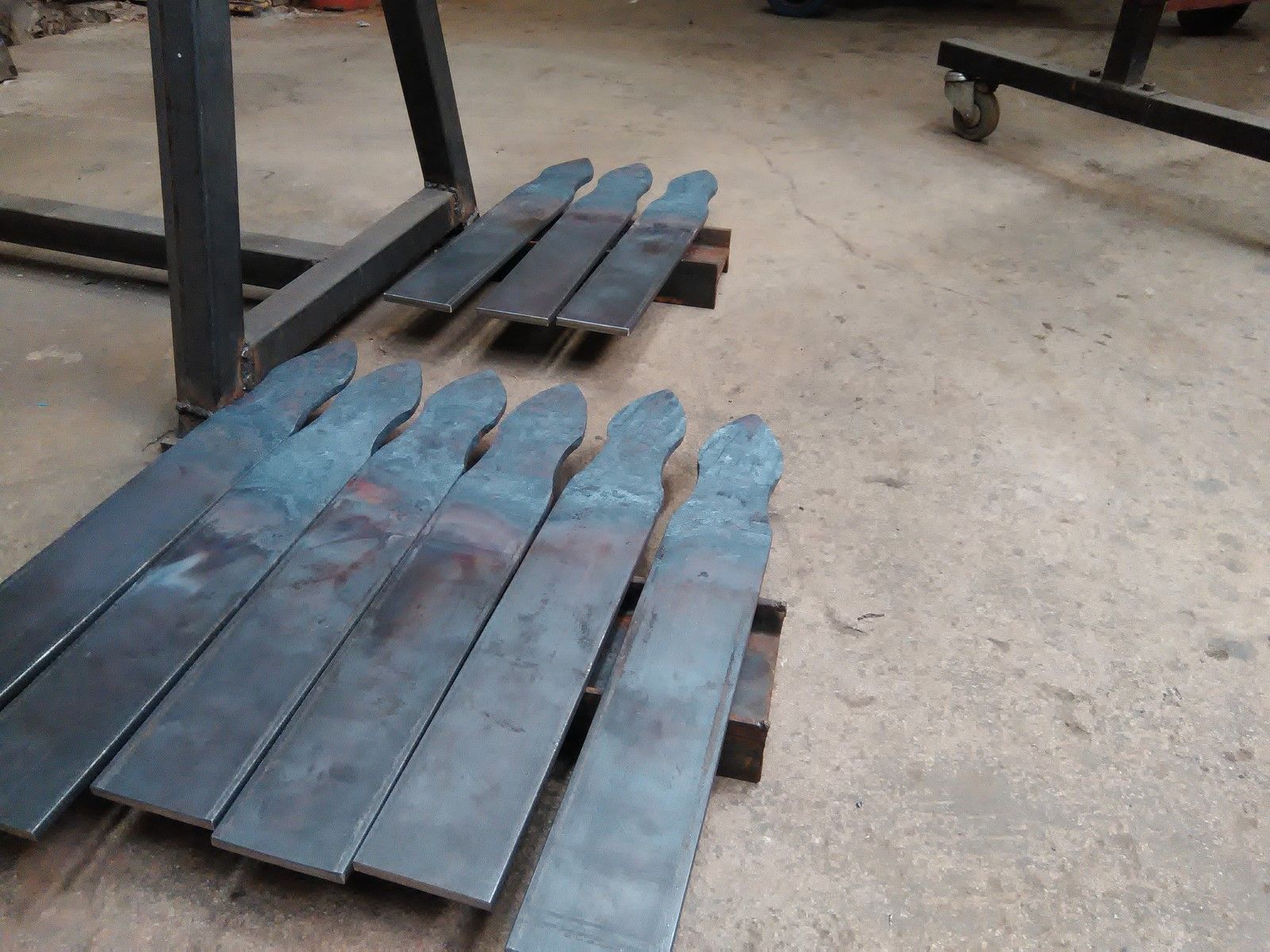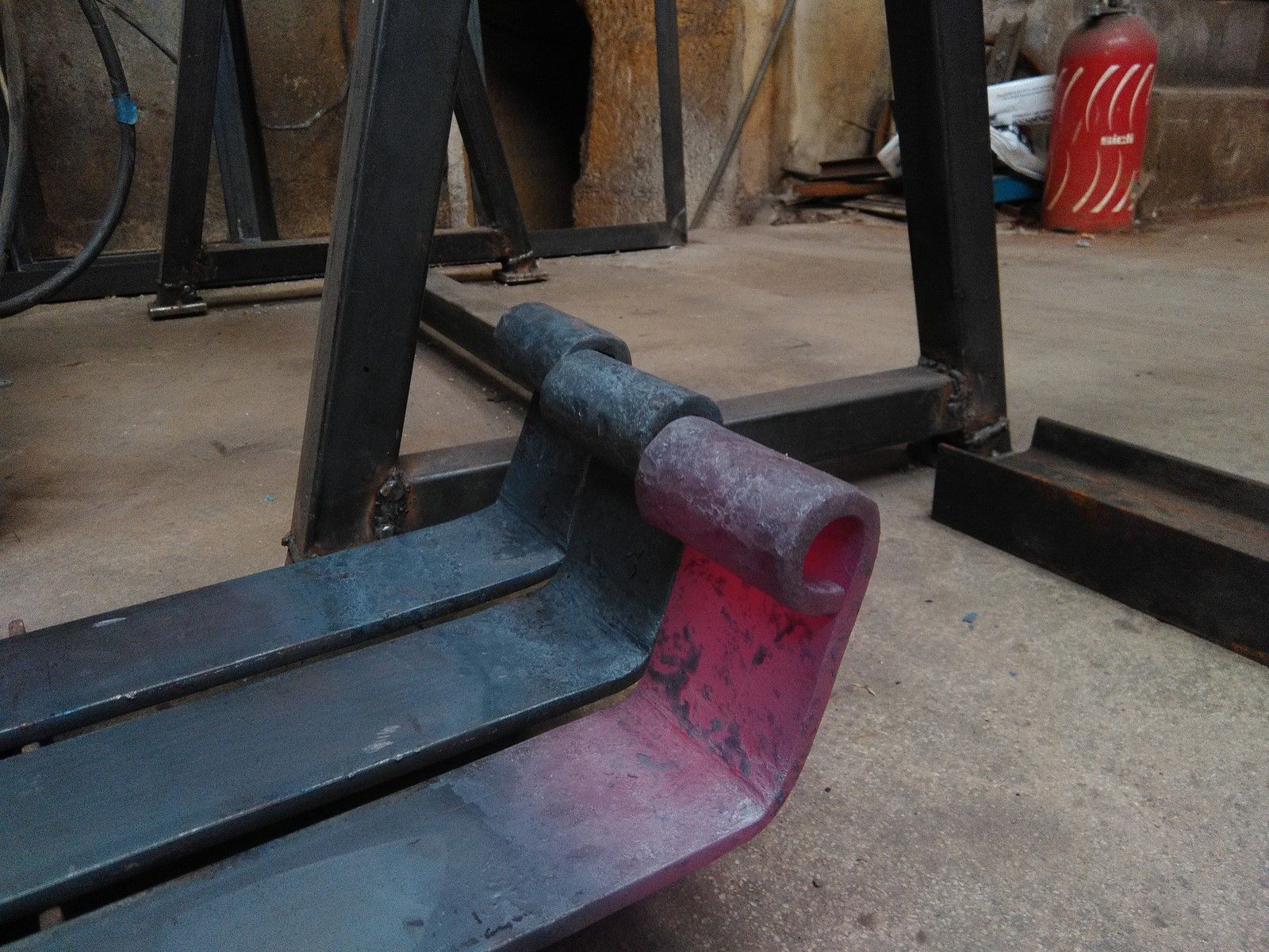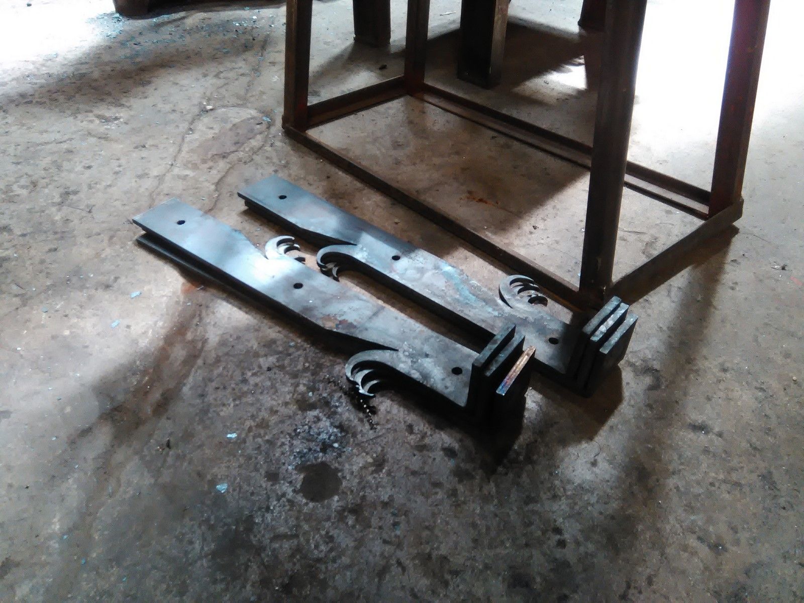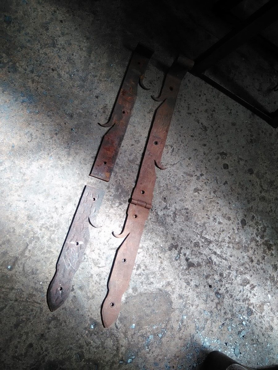 Nous avons donc fait des essais pour comprendre comment ces pentures avaient été forgées à l'époque, avant de nous lancer dans la fabrication définitive, dans une section d'acier de 70x8 mm. Ces pentures sont articulées en leur milieu. Les charnières utilisées à l'époque n'existant plus dans le commerce, nous avons recréée ces charnières à l'identique. Toutes les parties de ces pentures sont réalisées à la forge, comme les gonds principaux devant accueillir un pivot de 20mm de diamètre.