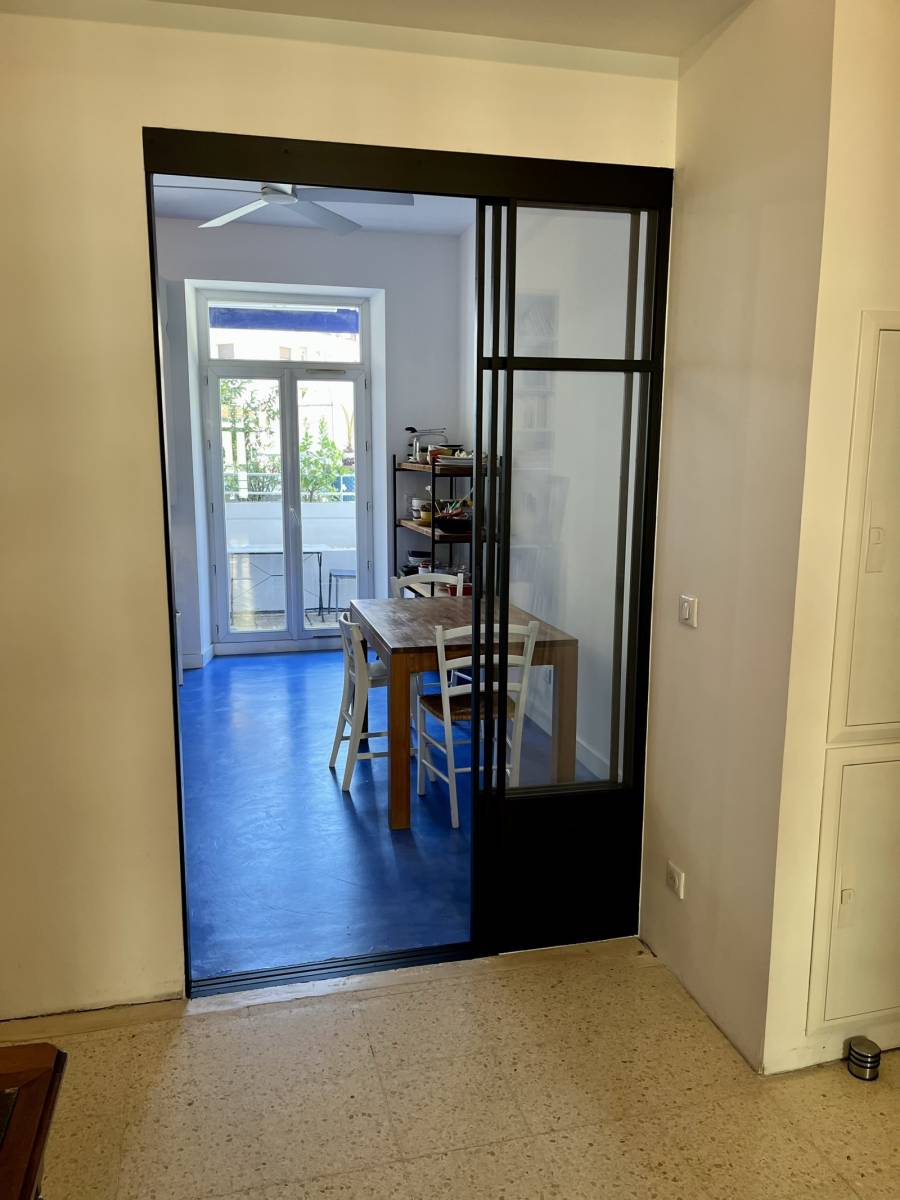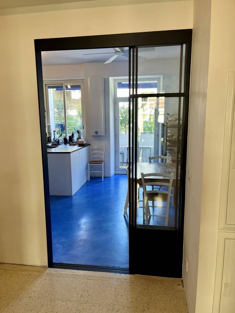 Nous avons donc conçu ce système de portes coulissantes qui peuvent coulisser l’une derrière l’autre, guidées par un rail que nous vous fabriqué sur mesure, et scellé dans le sol de l’appartement. Les portes s’actionnent l’une après l’autre sans avoir à les manipuler une par une, grâce à un système de « loquet artisanal ». Nous avons fait quelques essais avant de trouver le système le plus discret et efficace possible.