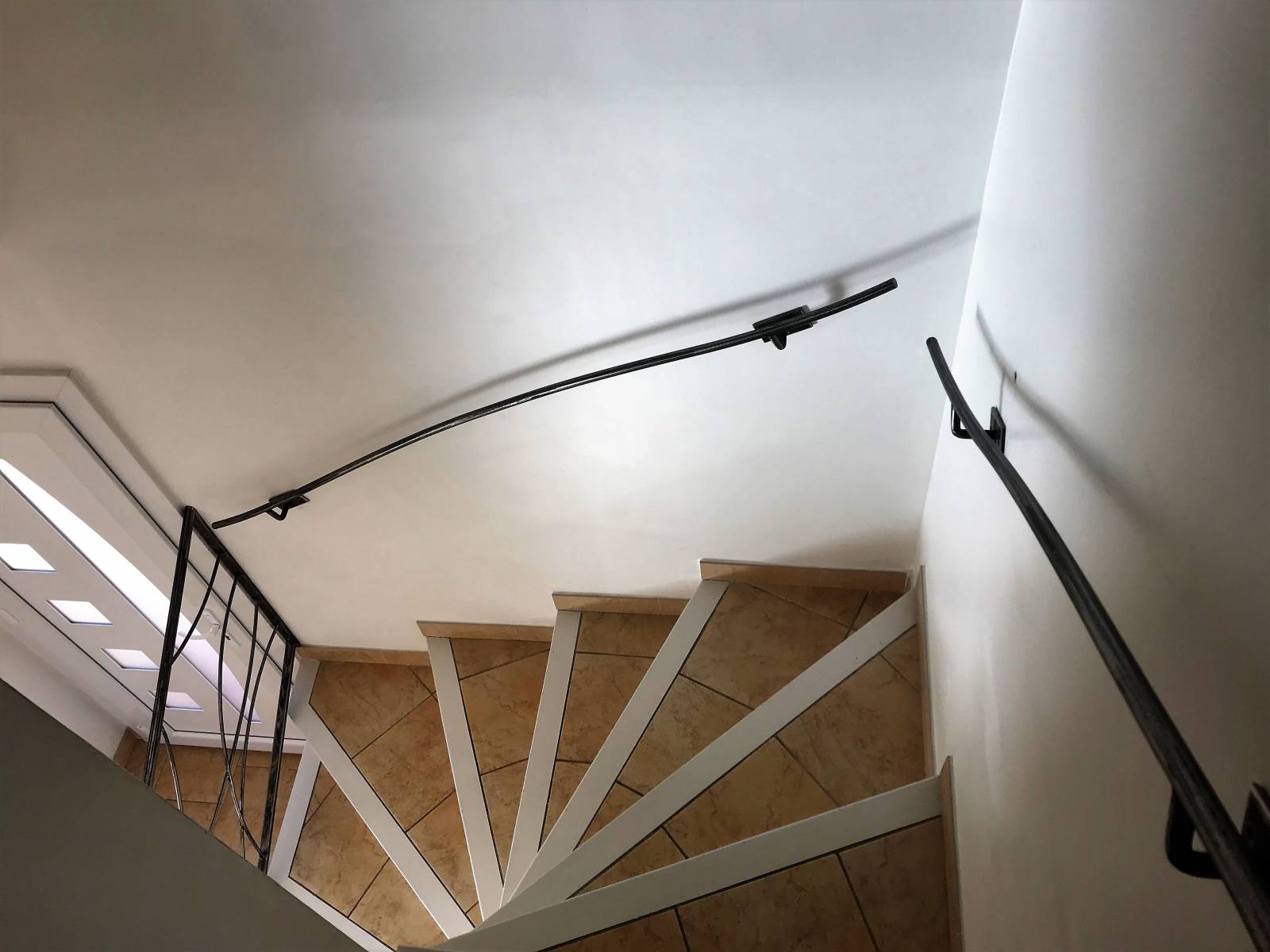 Le garde corps reprend ce système de rond plein légèrement galbés pour les motifs du milieu, mais dispose de profilés acier en demi-rond pour la partie main courante. Ce type de profilé permet de garder le côté rond et courbé de l'ensemble, et d'être plus agréable à saisir à la main qu'une rampe rectangulaire par exemple.