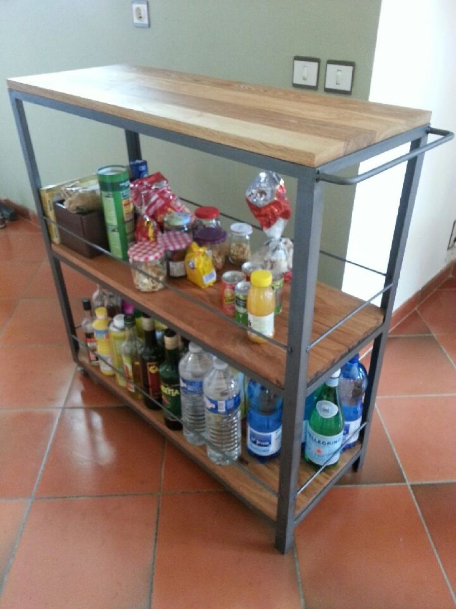 L'ensemble de la structure en acier de cette servante est peint dans une couleur gris ardoise, avec un effet martelé. Ceci donne un aspect presque acier brut, juste un peu plus clair, qui s'allie très bien avec la couleur un peu plus doncée du bois.