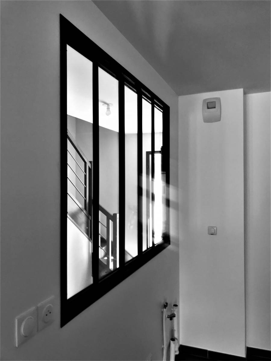 Nous avons rencontré un problème technique lors de la conception de cette verrière. La cloison est en placo alvéolé, donc sans rail si structure à l'intérieur qui permettte de poser la verrière dessus et de la fixer. Nous avons donc opté pour une fixation en façade, directement par les couvres champs, qui habillent les murs.
