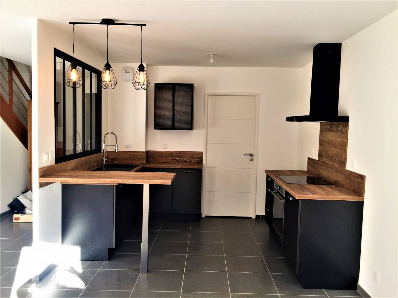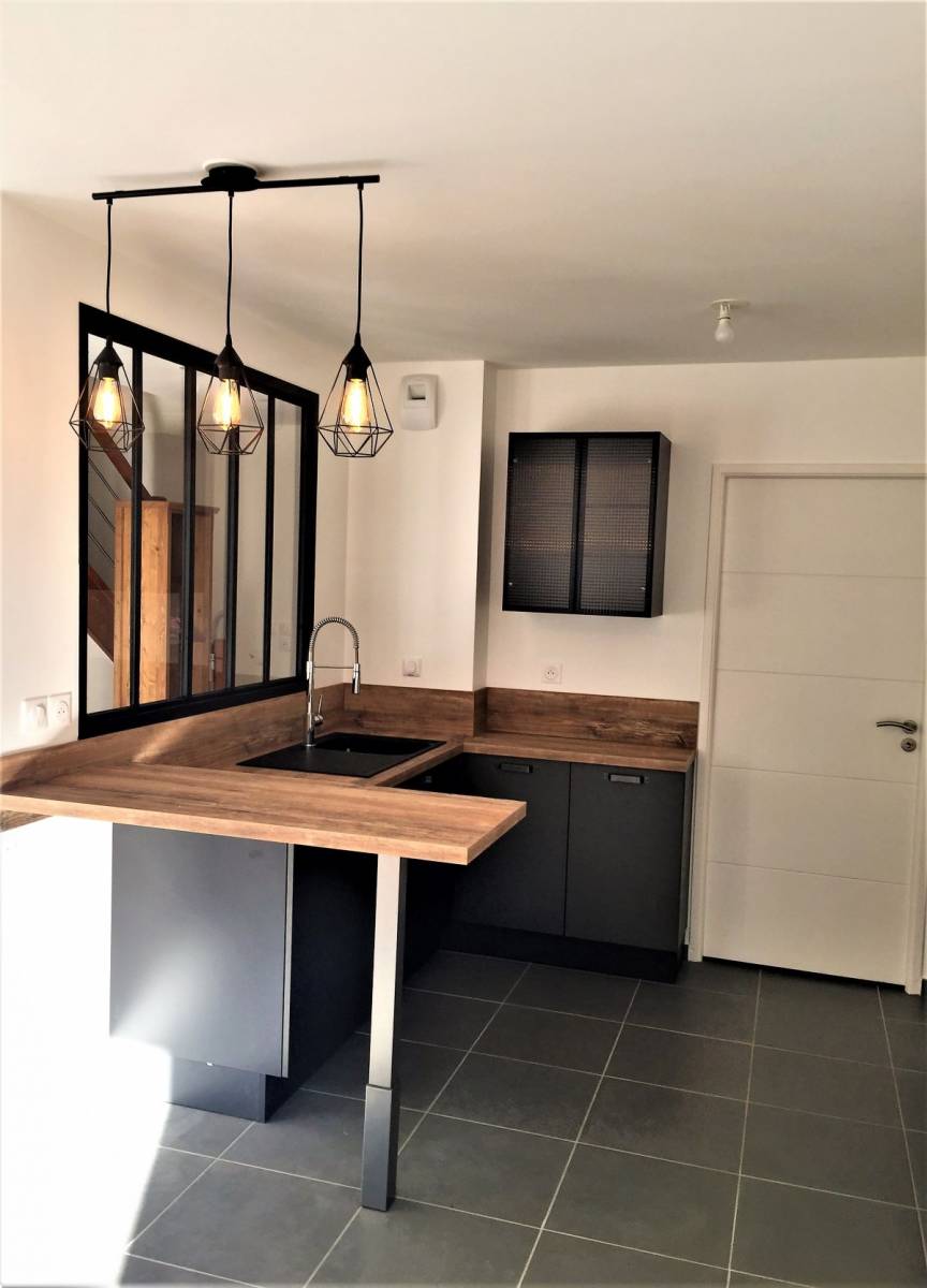 La verrière est peinte avec une peinture noir mat, donnant un très bel aspect avec l'éclairage des lustres de la cuisine.