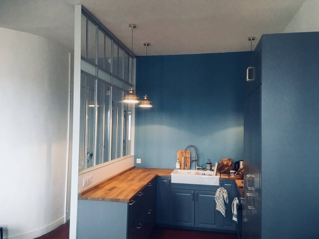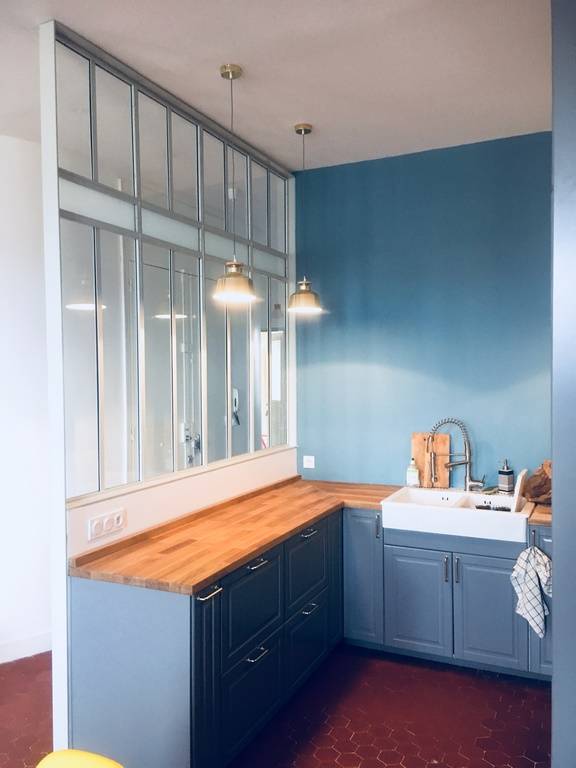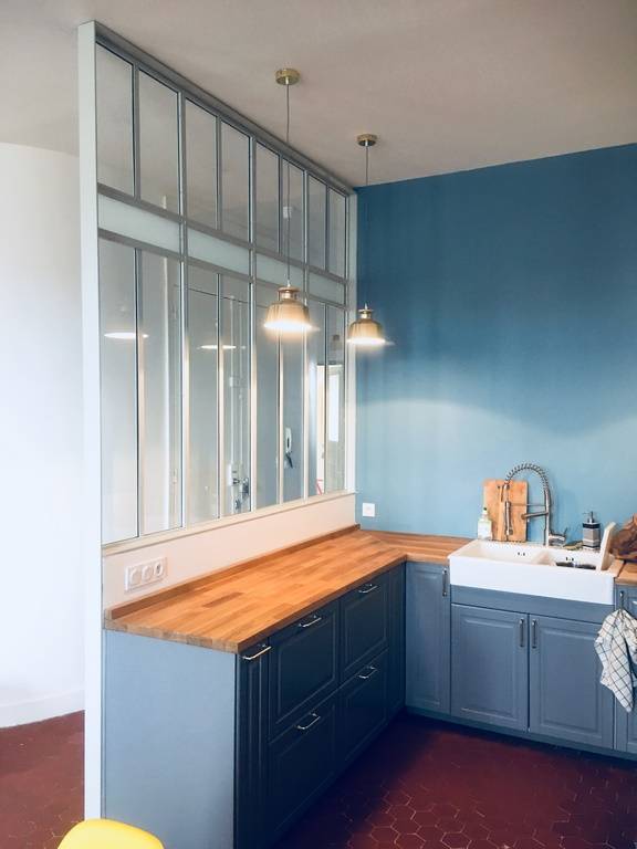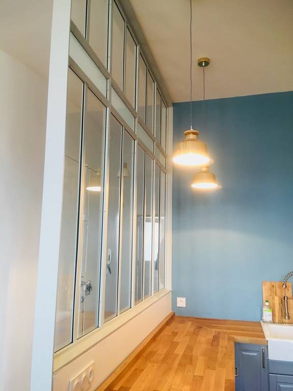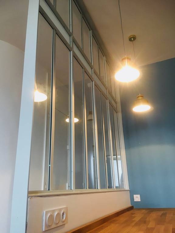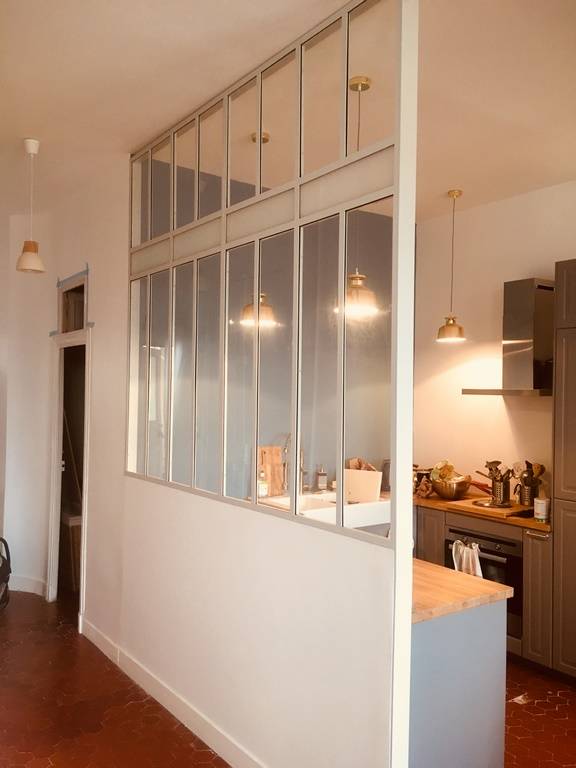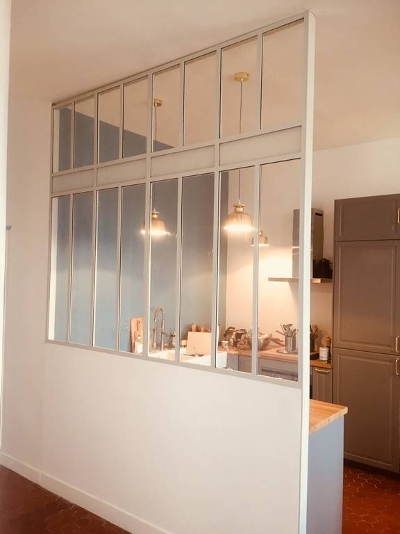 répondre aux besoins de clients, qui nous avaient contacté pour un projet particulier. Il s'agissait de rélaiser une cloison vitrée pour séparer la cuisine de la pièce principale de l'appartement, tout en respectant son cachet ancien.