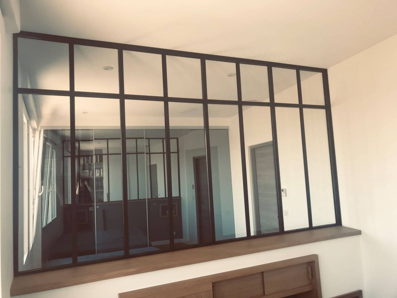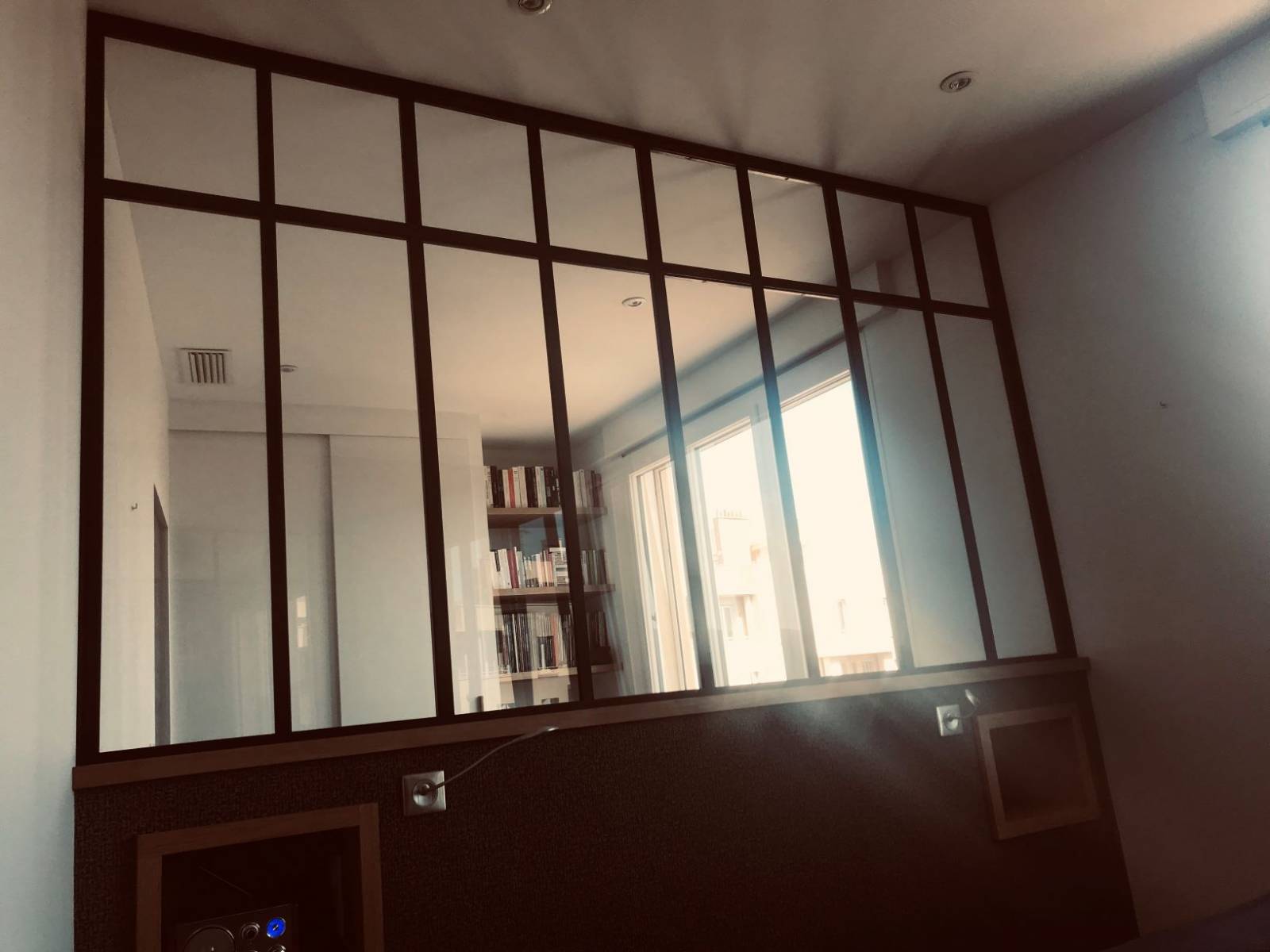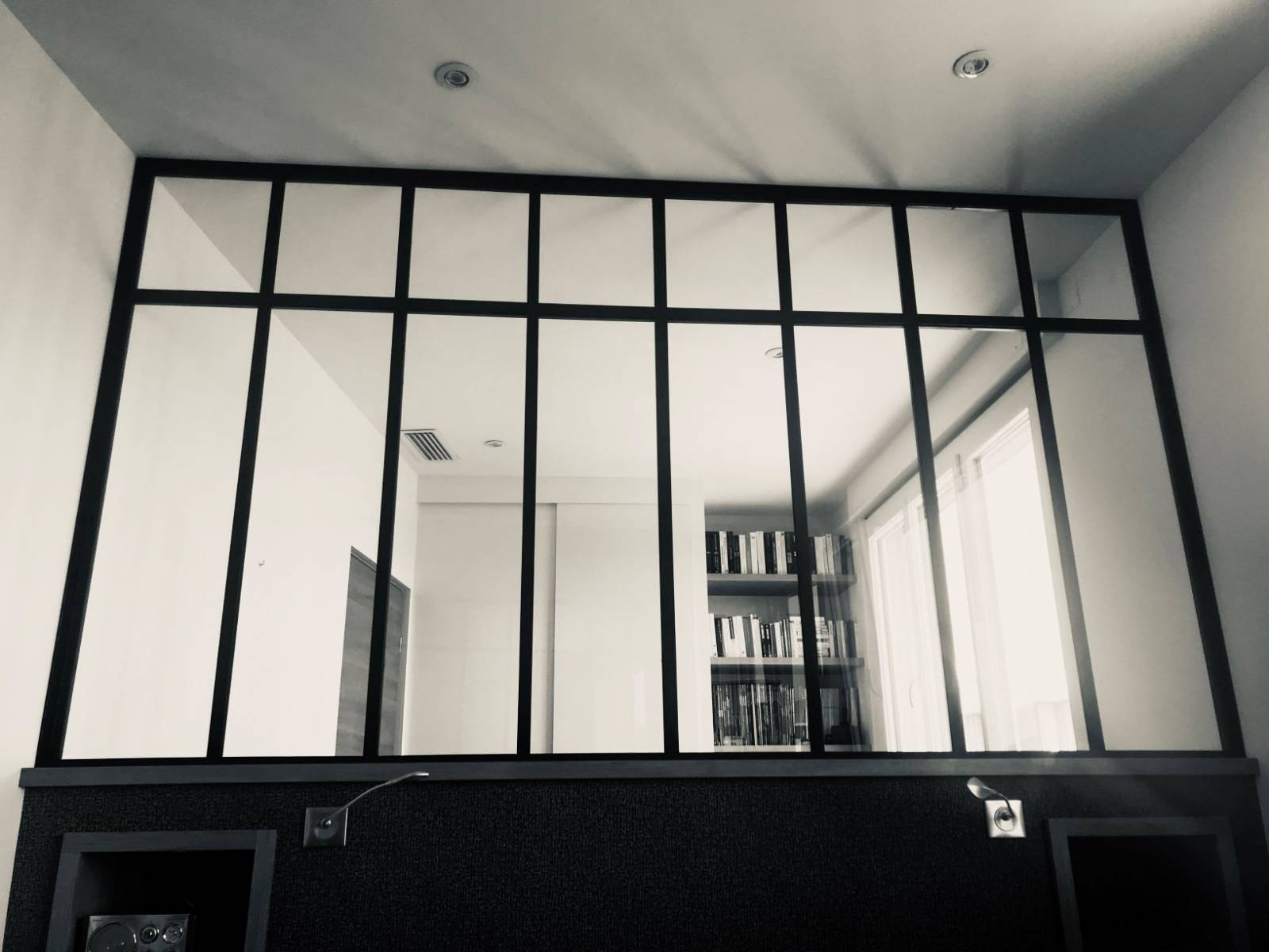 Nous avons réalisé cette verrière à Marseille 13008, pour des clients qui souhaitaient cloisonner une grande pièce, qui servait de chambre et de bureau. Le but était de fermer avec une cloison vitrée, pour isoler la chambre du bureau, laisser passer la lumière et apporter du cachet à l'ensemble.